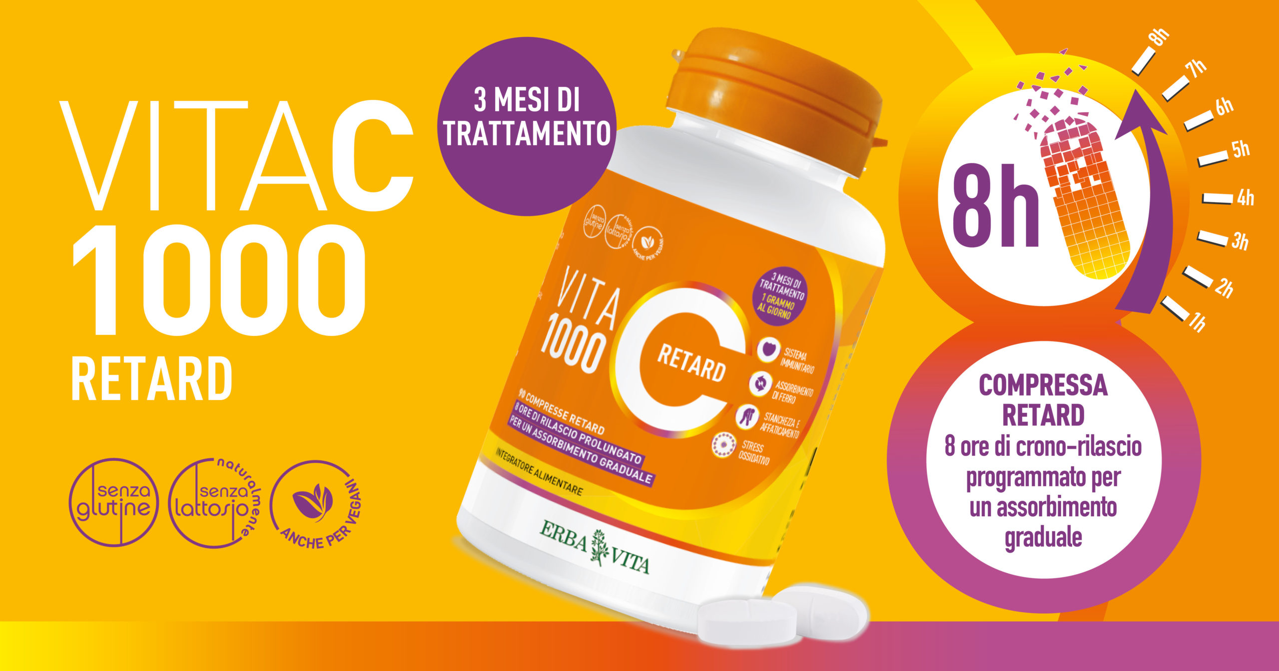 VITA C 1000 RETARD è l’integratore di Erba Vita che contiene un grammo di vitamina C con rilascio prolungato di 8 ore, grazie alla formula RETARD.